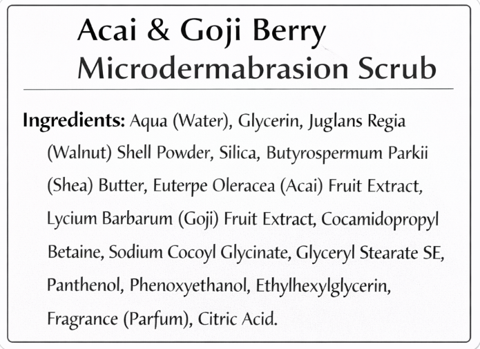 Aqua (Water), Glycerin, Juglans Regia (Walnut) Shell Powder, Silica, Butyrospermum Parkii (Shea) Butter, Euterpe Oleracea (Acai) Fruit Extract, Lycium Barbarum (Goji) Fruit Extract, Cocamidopropyl Betaine, Sodium Cocoyl Glycinate, Glyceryl Stearate SE, Panthenol, Phenoxyethanol, Ethylhexylglycerin, Fragrance (Parfum), Citric Acid.