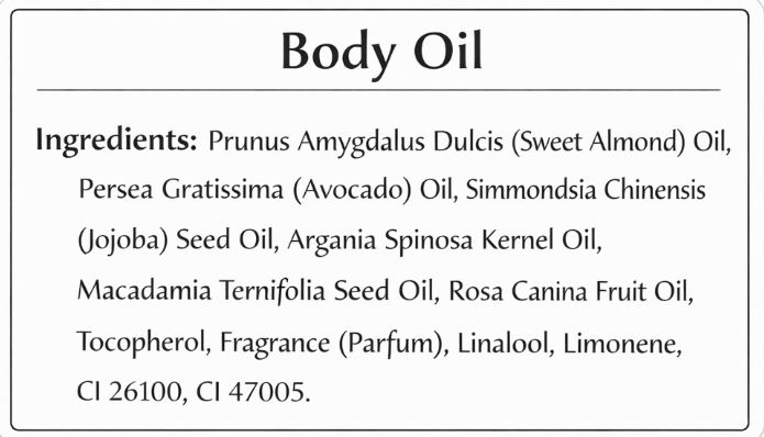 Prunus Amygdalus Dulcis (Sweet Almond) Oil, Persea Gratissima (Avocado) Oil, Simmondsia Chinensis (Jojoba) Seed Oil, Argania Spinosa Kernel Oil, Macadamia Ternifolia Seed Oil, Rosa Canina Fruit Oil, Tocopherol, Fragrance (Parfum), Linalool, Limonene, CI 26100, CI 47005.