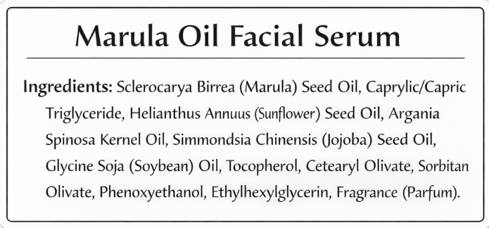 Sclerocarya Birrea (Marula) Seed Oil, Caprylic/Capric Triglyceride, Helianthus Annuus (Sunflower) Seed Oil, Argania Spinosa Kernel Oil, Simmondsia Chinensis (Jojoba) Seed Oil, Glycine Soja (Soybean) Oil, Tocopherol, Cetearyl Olivate, Sorbitan Olivate, Phenoxyethanol, Ethylhexylglycerin, Fragrance (Parfum).